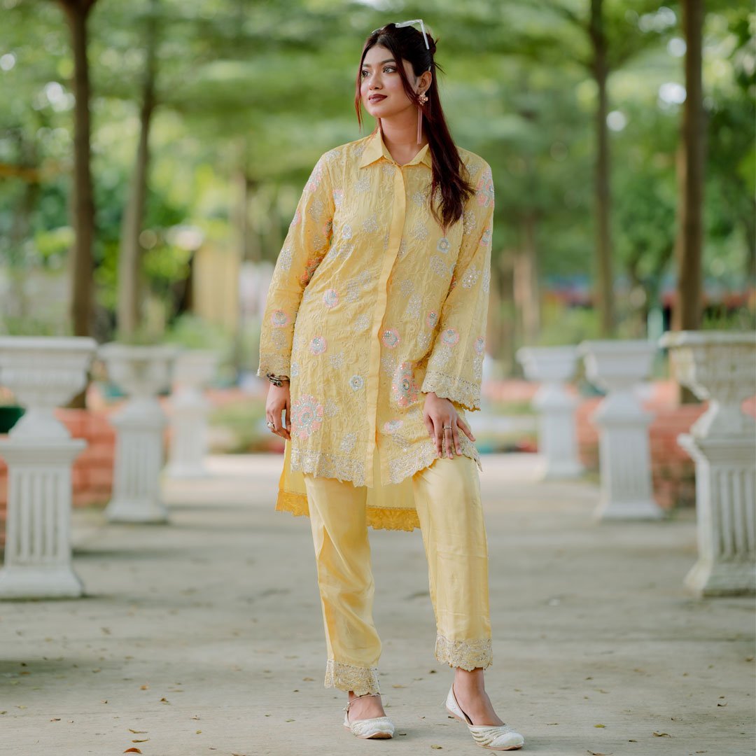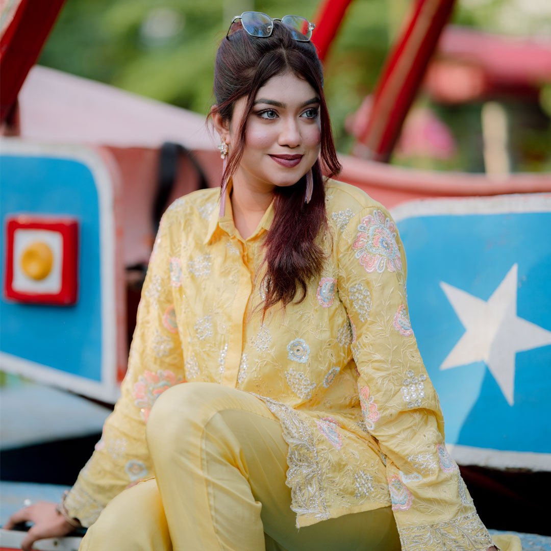হালকা হলুদ রঙের ফ্লেয়ার্ড আনারকলি সেট, চোখজুড়ানো হ্যান্ড এমব্রয়ডারি ও ফ্লোরাল ডিজাইনে সাজানো। আরামদায়ক ও স্টাইলিশ, যেকোনো ডে টাইম ইভেন্টের জন্য একদম পারফেক্ট।