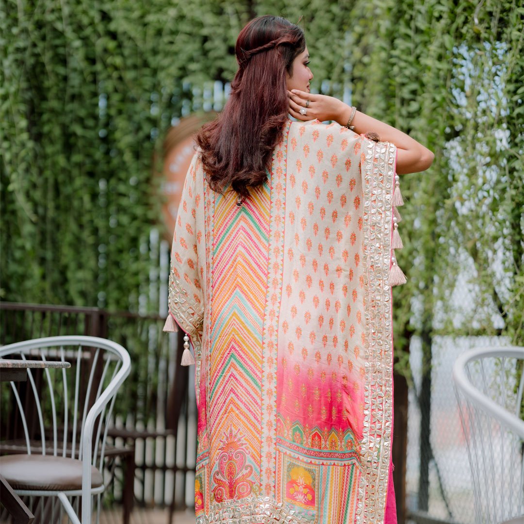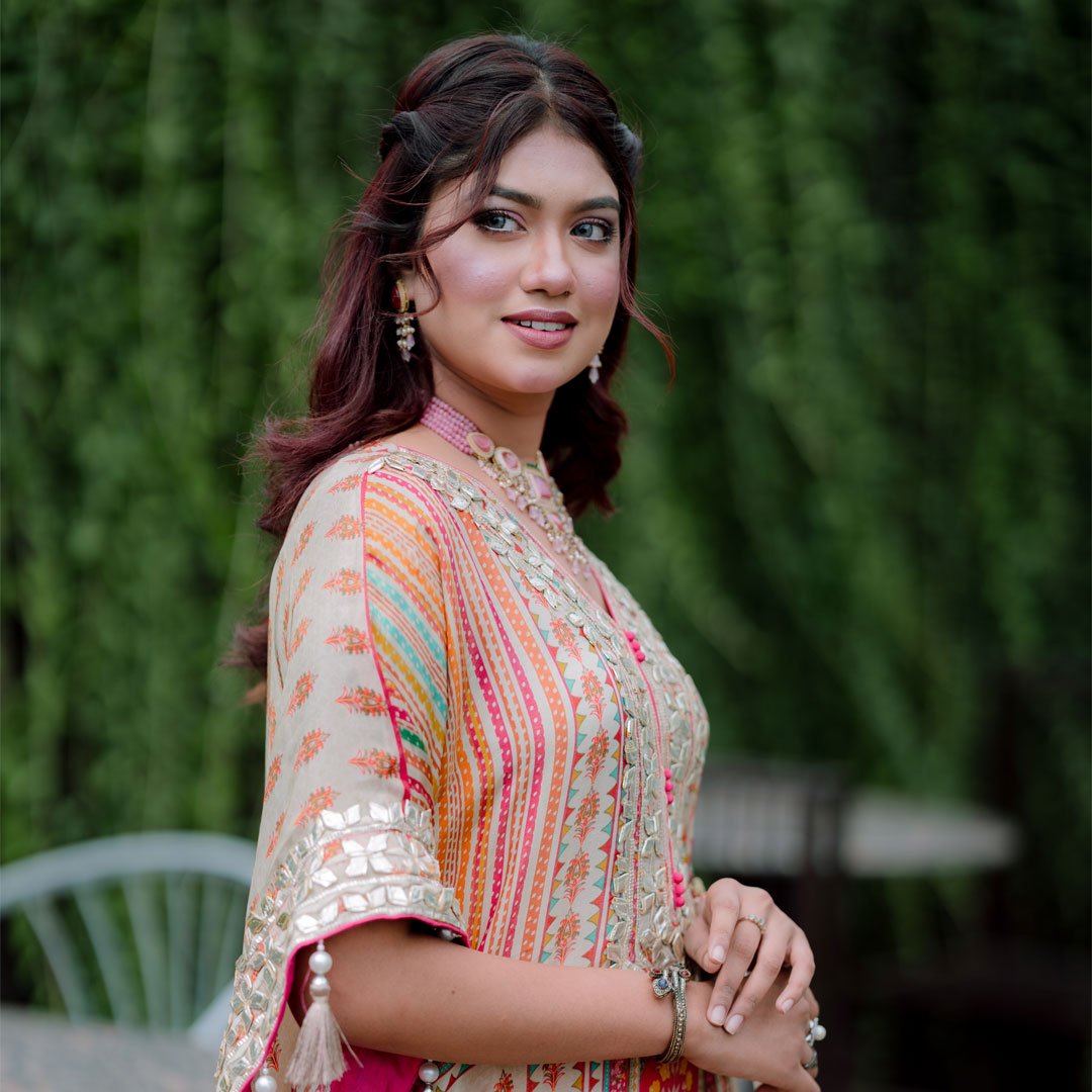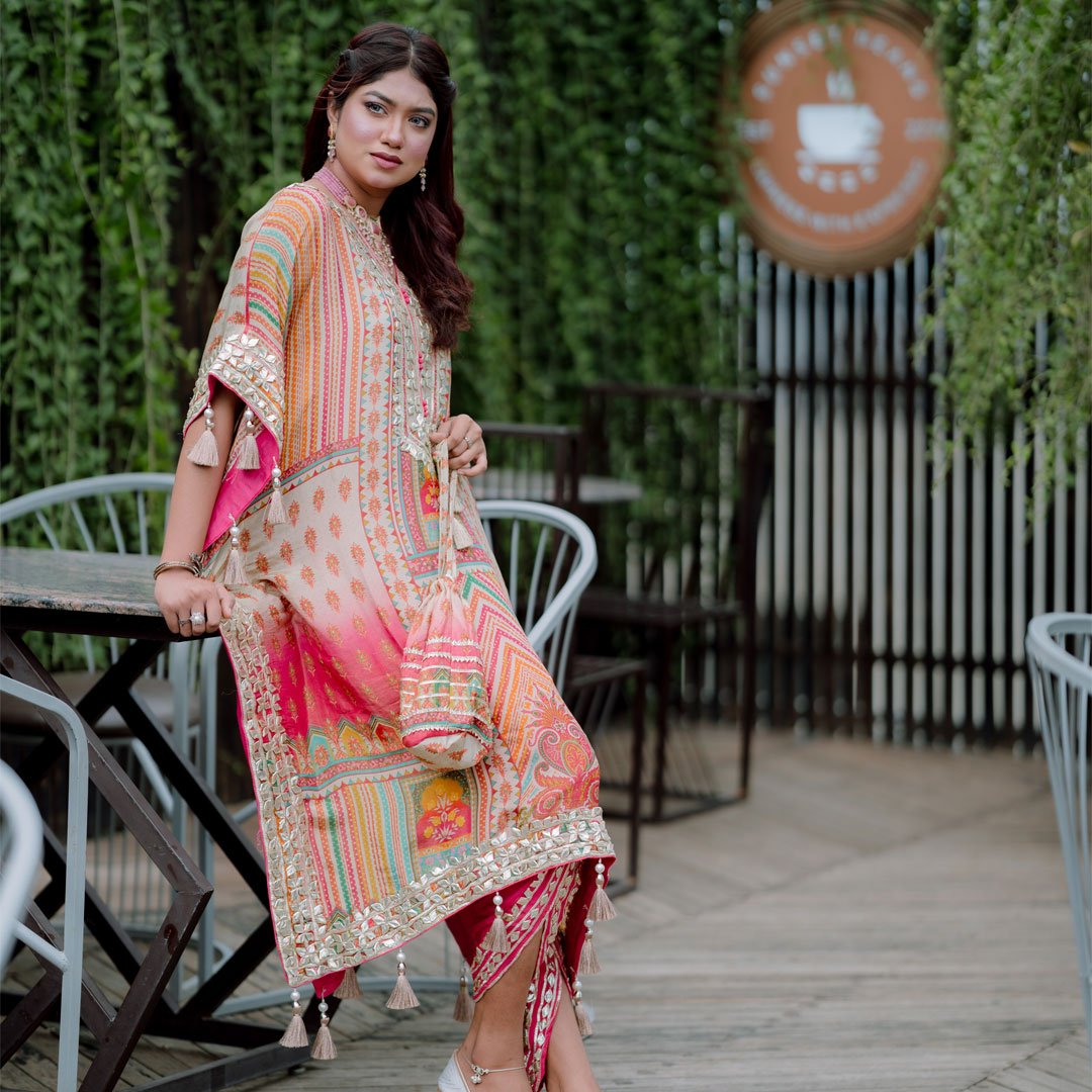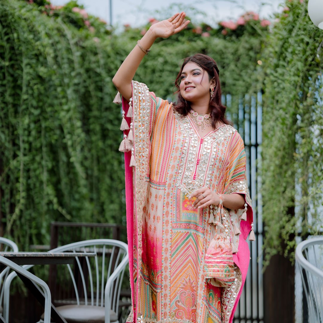 ট্র্যাডিশনাল ফ্লেয়ার্ড কাফতান প্রিমিয়াম সিল্ক ও কটন লাইনের সমন্বয়ে তৈরি। মাল্টিকালার এমব্রয়ডারি, মিরর ও জরদৌজি হ্যান্ড ওয়ার্ক, স্লিম ফিট কোমর এবং ম্যাচিং পটলি ও নগ্রা জুতা সহ পরিপূর্ণ উৎসব লুক!
